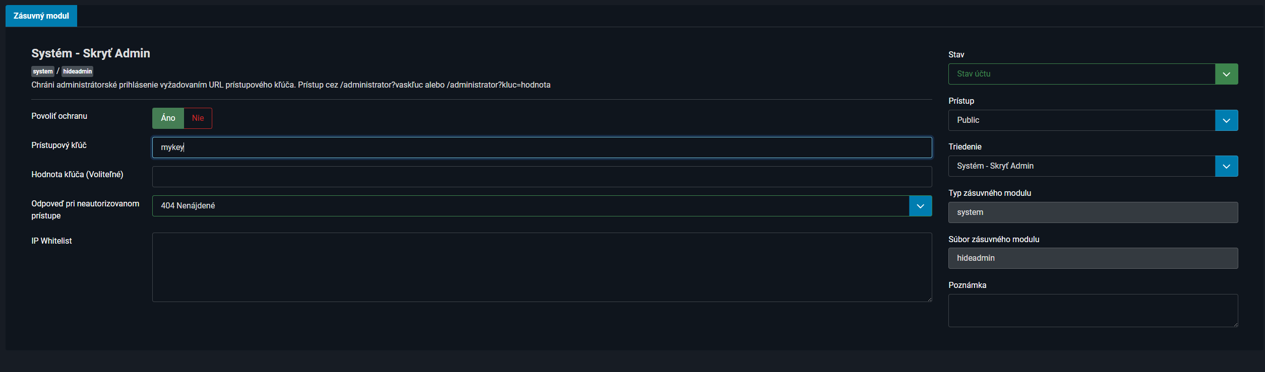 - Prístupový kľúč - zadáte vlastný prístupový kľúč napríklad mykey a do administrácie sa následne dostanete cez url /administrator?mykey